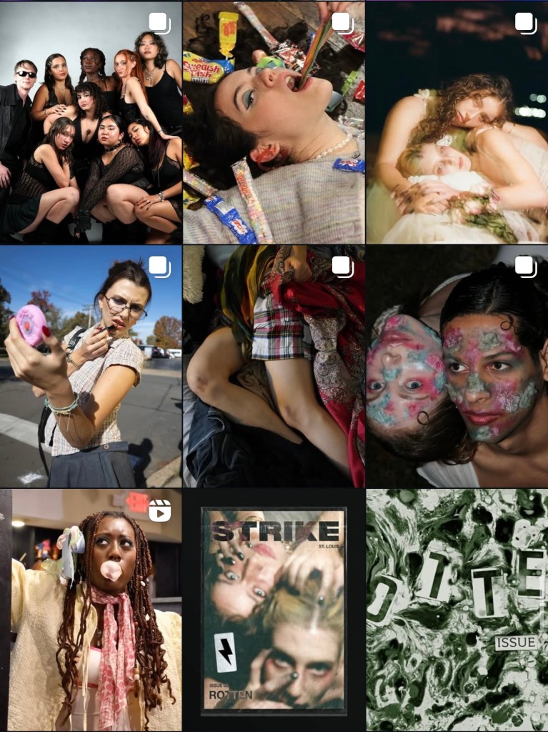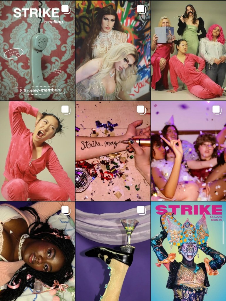 During my tenure as Editor-in-Chief of Strike Magazine St. Louis (@strikemagazinestl on Instagram), I worked with my co-editor and our social media team to reshape our social strategy, leading to a 412% increase in impressions. We looked at post analytics, defined our target audiences, and thought more carefully about what they wanted to see from us, and adjusted accordingly, putting together a content calendar and feed moodboards that corresponded with the theme of each semester’s issue. We decided to post about new blog posts only on stories rather than feed, and focused our feed posting on our editorials, events, and membership information.