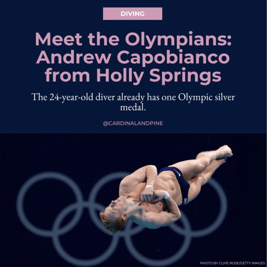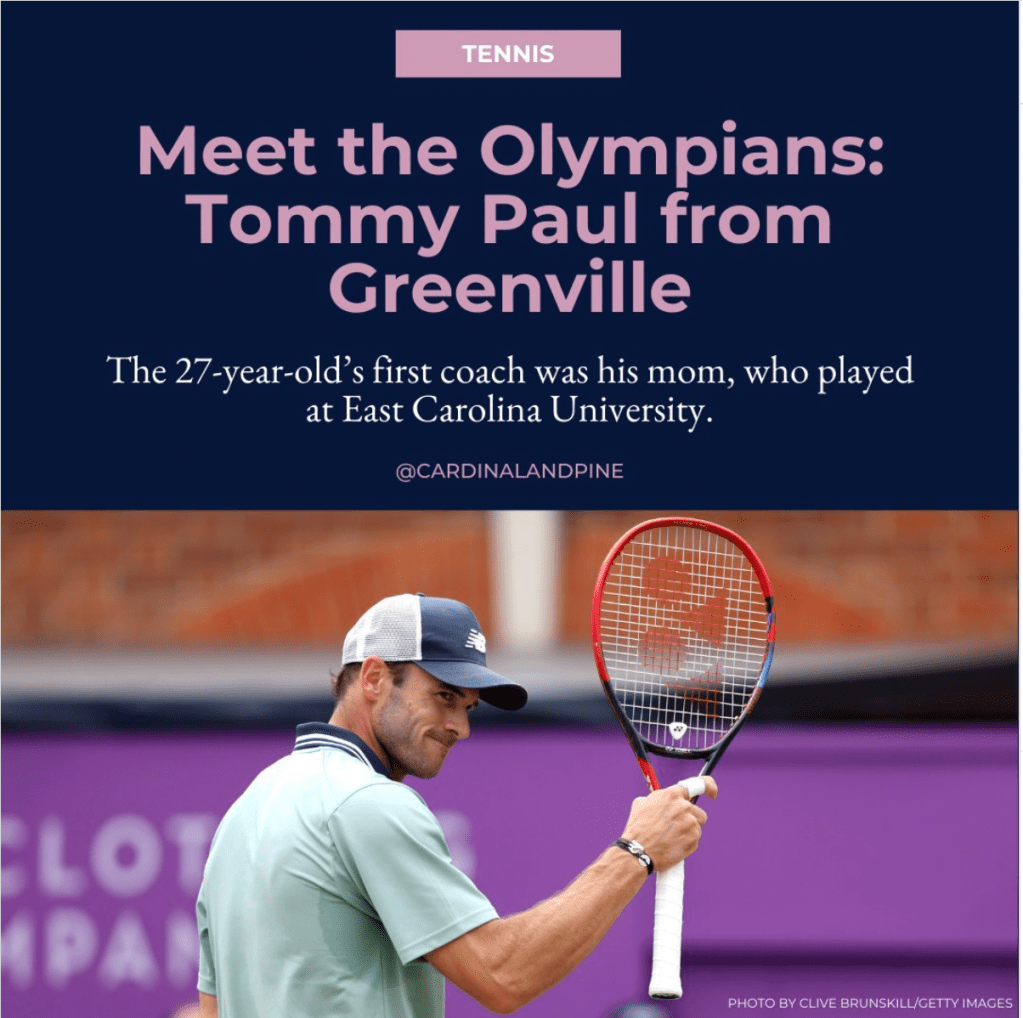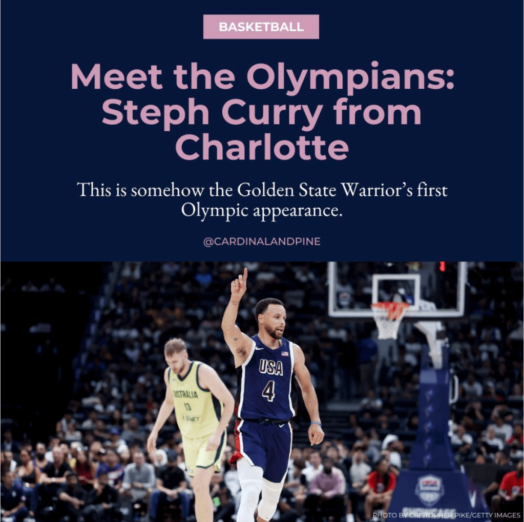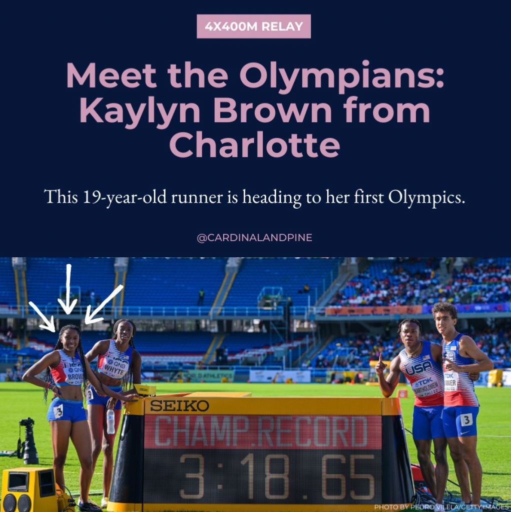 As the Editorial Intern at Cardinal & Pine during Summer 2024, I spearheaded a social media series across Instagram, Facebook, and X that highlighted local North Carolina athletes competing at the Paris 2024 Olympics and Paralympics. I sourced and credited images from Getty and Reuters, created graphics in Canva, and copywrote the headlines, subheads, and captions.